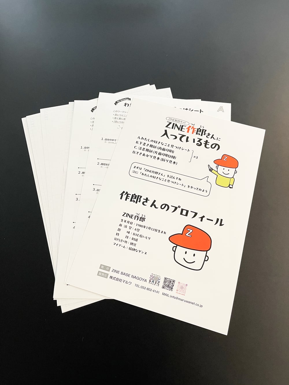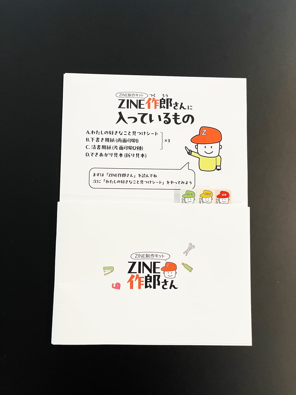 ・「ZINE作郎さんZINE」1冊:アイデア出し~印刷まで、キットの使い方と合わせて丁寧に解説したZINE。印刷会社ならではのアドバイスを盛り込んだ一冊。